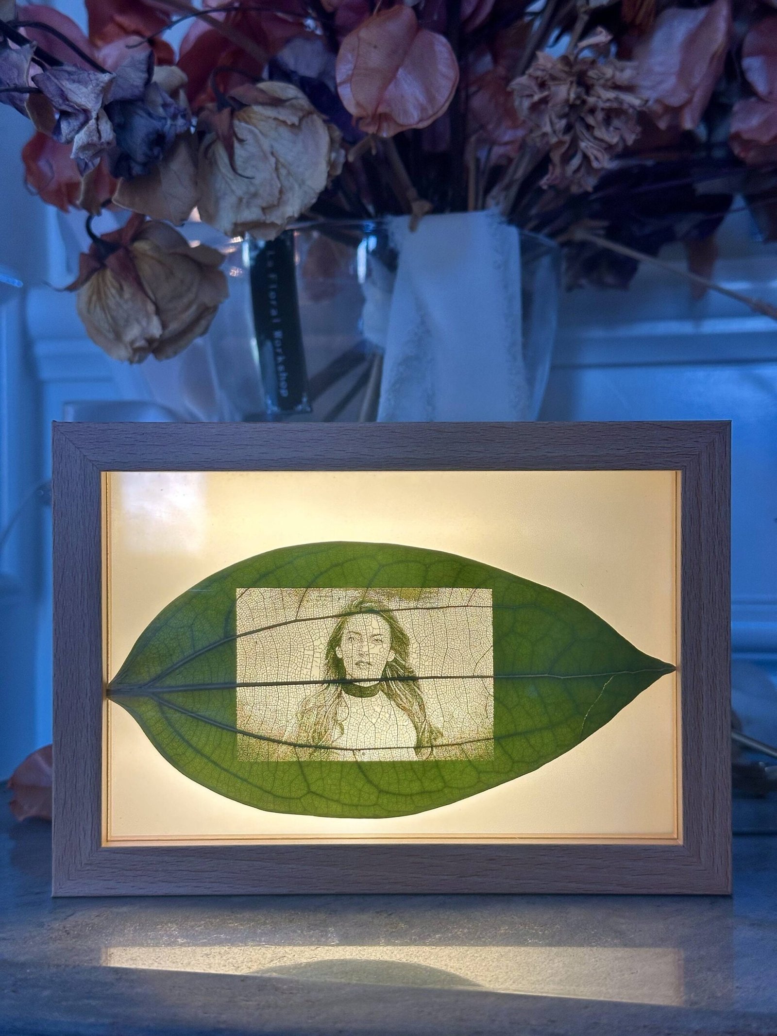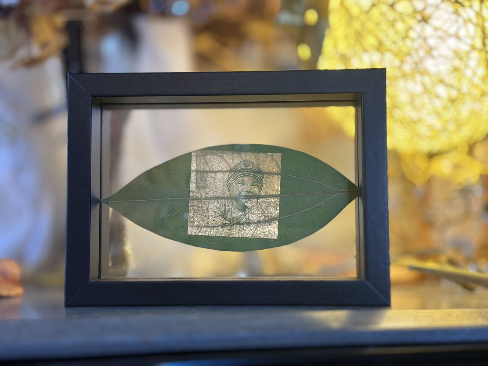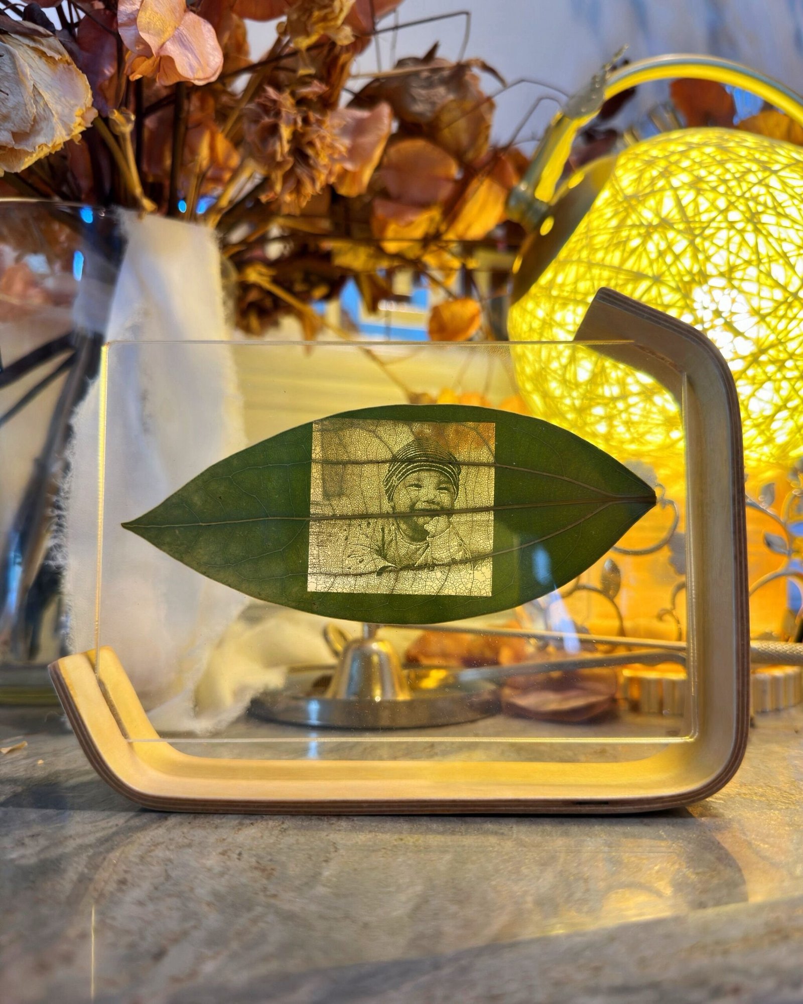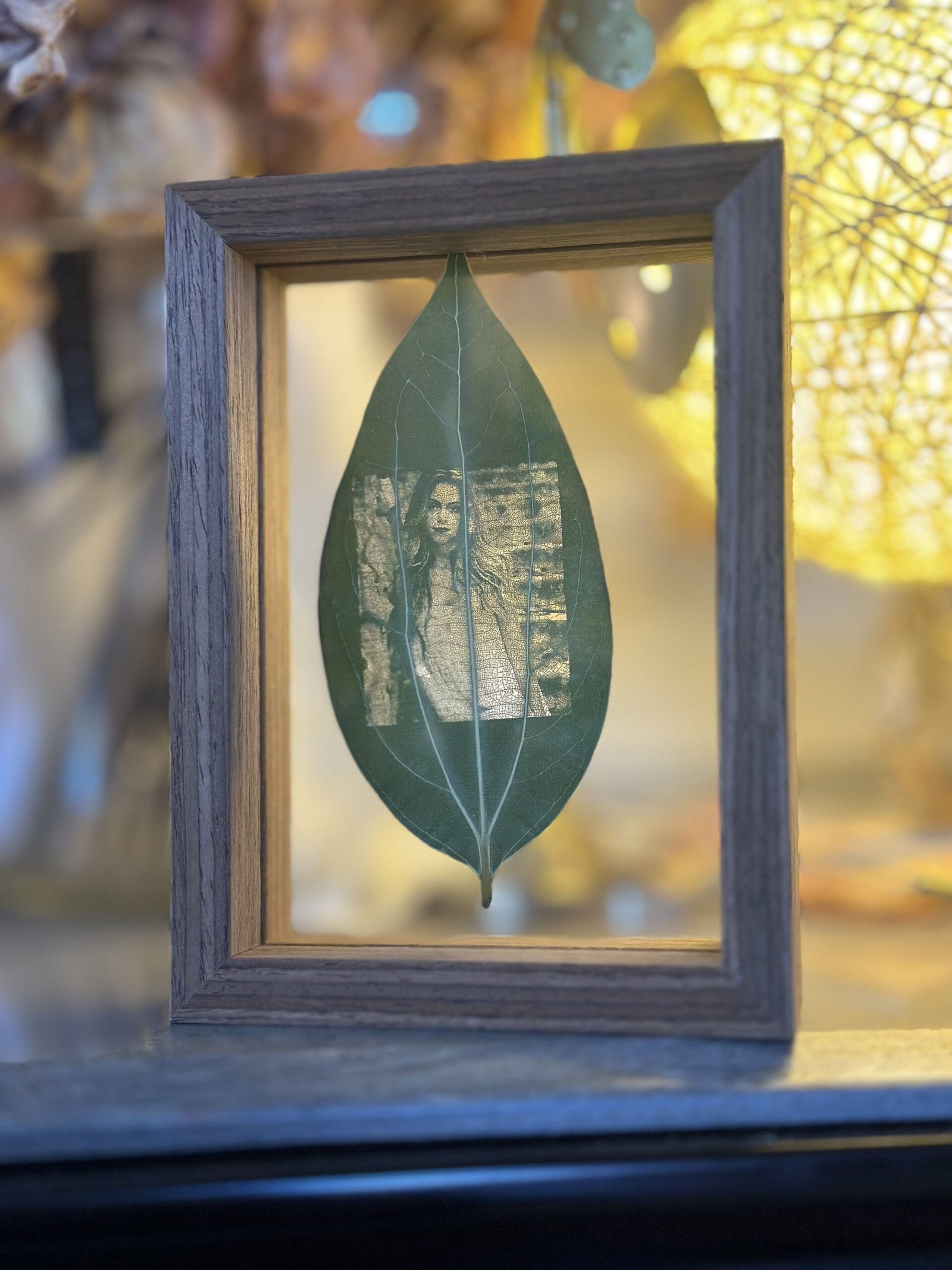 *When viewed under light or sunlight, the tree leaves reveal the embedded photo of your choice.